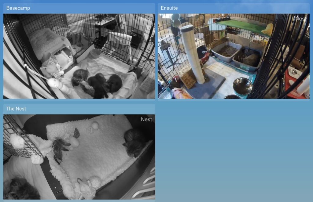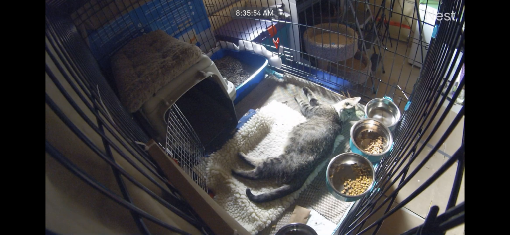 Here is a spoiler of the set-up in mid-August, as seen from our Cat Cam cockpit. The kittens are now 5 weeks, and Basecamp is where they sleep with or without Mitsy. The Nest is often empty, but the youngest kitten likes to sleep there. And Mitsy can take some alone time in a litter box. We think the ‘Yesterday’s News’ paper pallet litter material reminds her of the mulch she used to like to sleep on outside… Looks peaceful and roomy enough, huh?