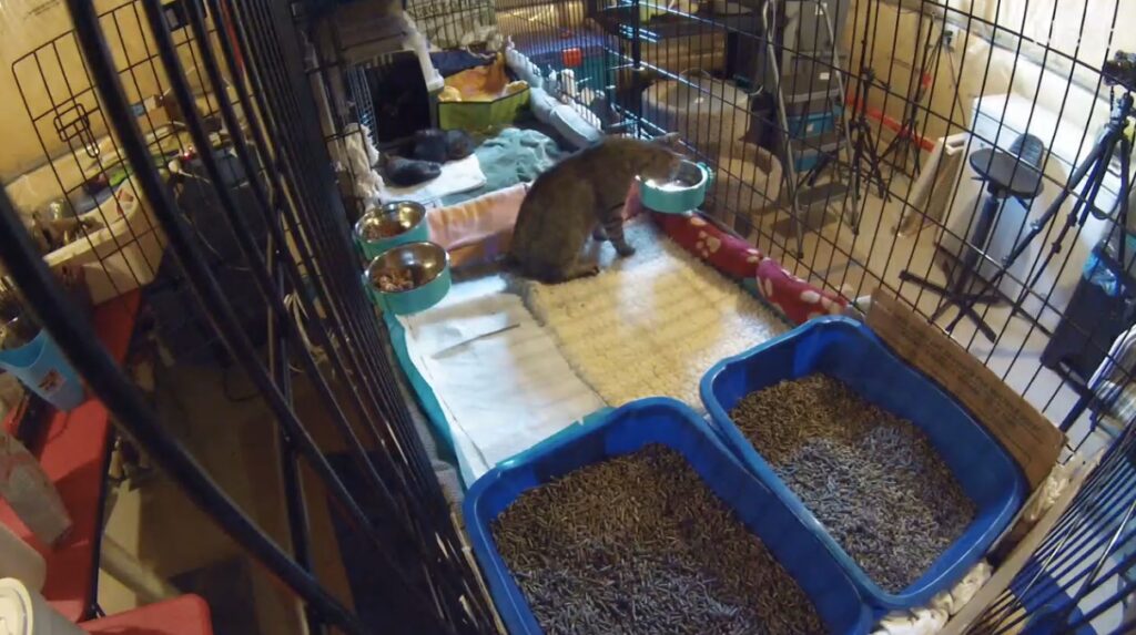 So, then I went into the Ensuite to make the changes there, and also to add some carton to the sides, to make it more kitten-proof and also to prevent the litter from going everywhere when Mitsy goes to the bathroom. I prepared some new food: every time I am down there, Mitsy sort of expects food or a treat now. That is fine. After she ate, she looked at the new Ensuite, again, without really venturing out. There was a moment where she sniffed the sides of the litter boxes, but showed no further interest. When she went back to Basecamp, the whole family came out and I had some fun touching many of the bigger kittens. I have to be honest: I cannot tell the grey ones apart. I can tell who Kabiri is, but there are 3 other tabbies. Time will tell who is who. I hope 🙂