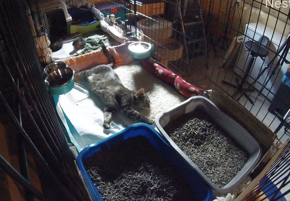 That afternoon I kept my eye on the cameras. I saw Mitsy try the new bed, but then leave it. I think that it is too squished for comfort. I then suddenly thought of the foldable litter boxes that I bought online a while ago. I was hoping they would be less wide than ours and that we could use them instead of the plastic one, to minimize the aggression. But they are very flexible and it would be impossible to push them in or manipulate them without causing the same disruption as the other ones. But they are really just shallow trays and I decided to put one of those in the old litter space. I put a blankie in there that Mitsy slept on under the AC unit. She did try it out, but this morning it felt as if it needed something more. That blankie could be too hot. So I put a regular old towel on top of it. Makes it a bit cooler I think.