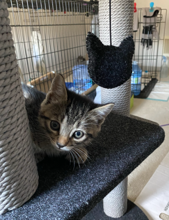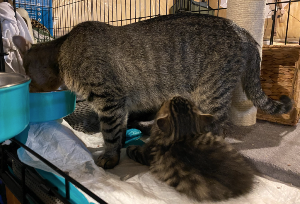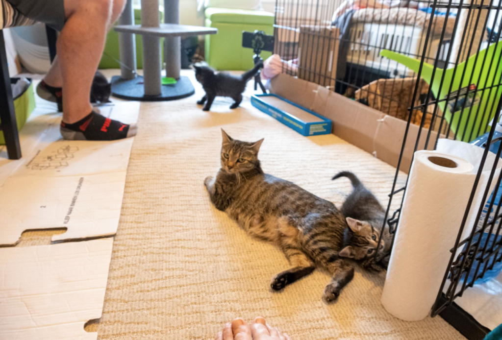 It was the start of the most delightful phase in kitten-caring. Mitsy adjusted smoothly to every change and it was clear that we had built a solid foundation of trust with her. We were never attacked. Sometimes we got warnings and she only let us touch her at mealtime. But we felt we had started a new stage in the socialisation process. Now all we needed was time. And hours and hours of hard work. Up and down the stairs after poop-scooping, bringing new food, clearing out old food, coming in for play, cleaning towels and spilled litter, and watching the room cameras when we were not in with the cats ourselves. It was wonderfully exhausting and rewarding!