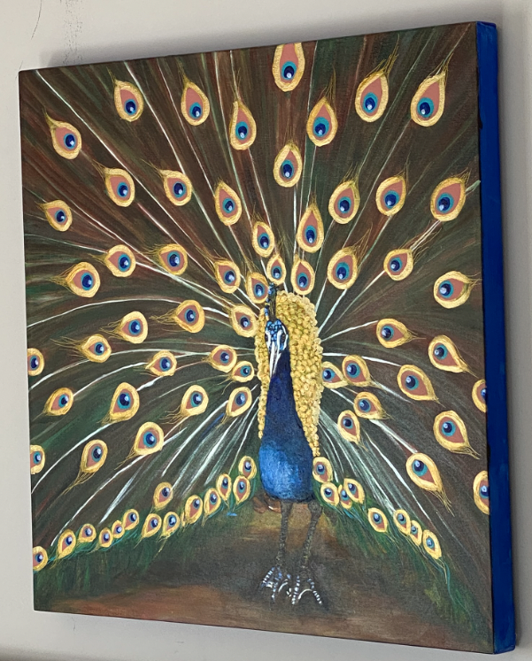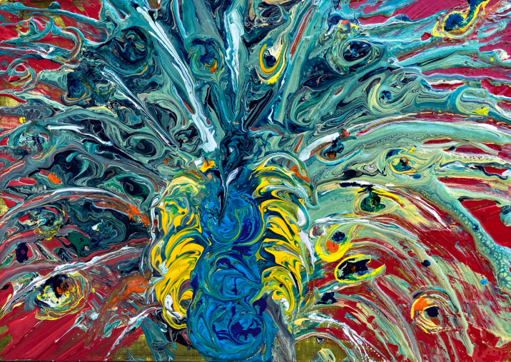 One is a large 24:24 inch mounted canvas of a peacock, with some irridescent paints. It was a study for a future even bigger piece. The other, by contrast, is a small panel (8:10 inch), created with pouring technique. It is not as abstract as the two I discussed in my previous post. It is… semi abstract, I guess. If you don’t see a peacock in it, that it totally fine too. I might still work on this in the future, when it is completely dry.