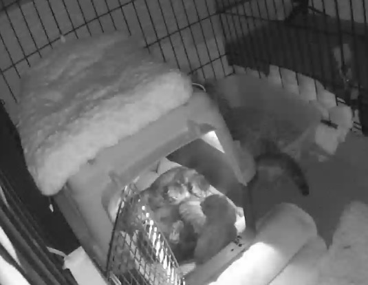 Mitsy uses her tail to create a bridge between her and the kittens. She keeps an ‘eye’ on them while she sleeps outside the Nest, but with her tail connected. Sometimes she also uses her head or her leg.