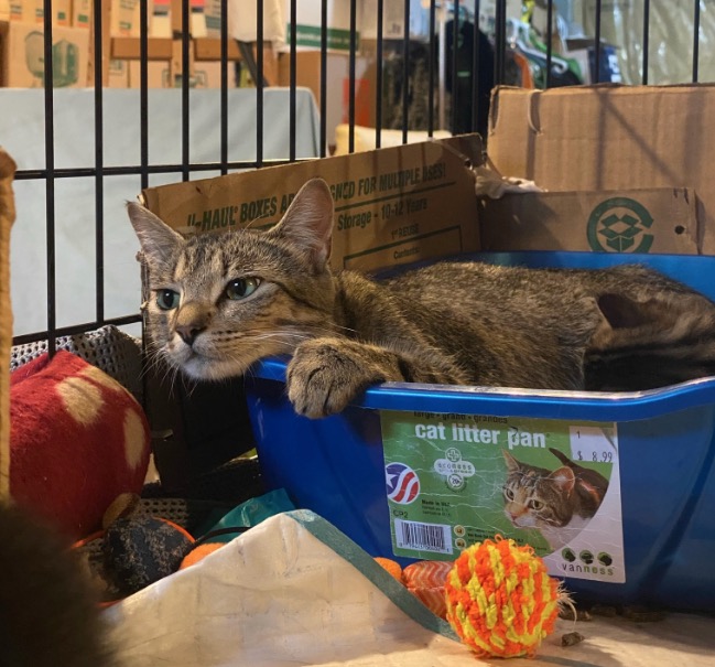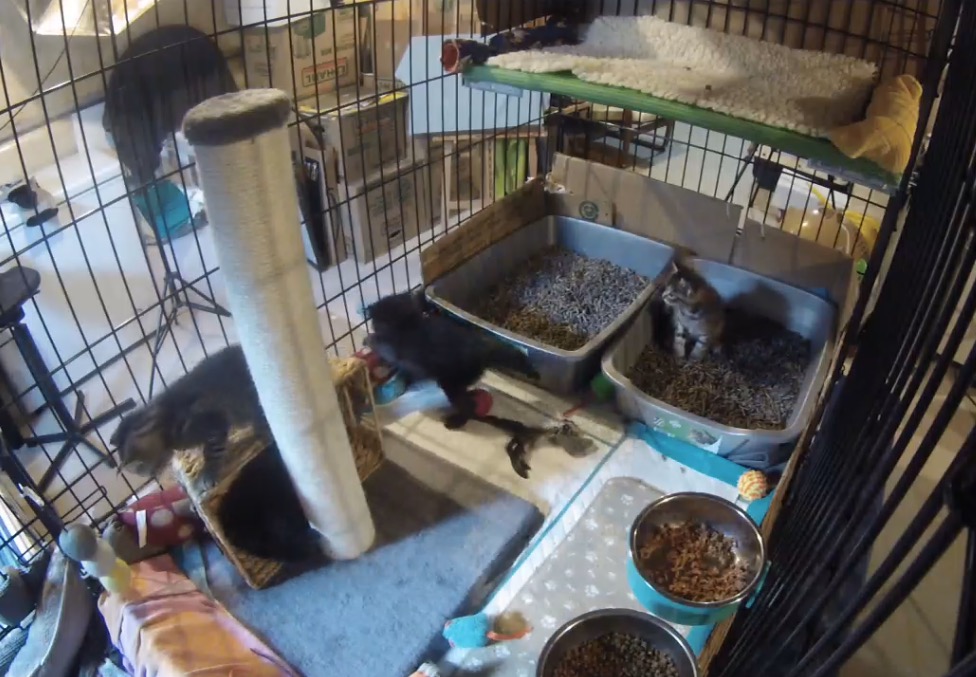 The Penthouse was never adopted… I don’t know if it was too close to the ceiling of the crate or that she simply was not interested. No amount of treats and even a bowl of sardines could coax her up there. Some of the kittens eyed it, though, from the top of the scratching pole…