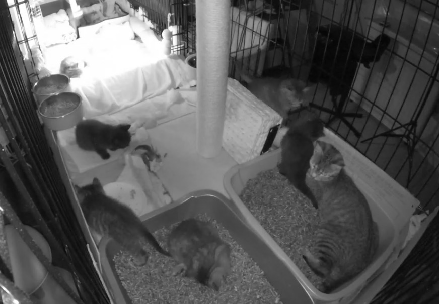 Mitsy now often sleeps in a clean litter box. Not exactly sure why she does that. Is it the feeling of the pellets that reminds her of mulch? Is it less stuffy than the Nest? Is it to hide from the kittens as the equivalent of leaving them to hunt or feed elsewhere if she were still living outside? Who knows. In the beginning the kittens did not find her there, but by now they do.