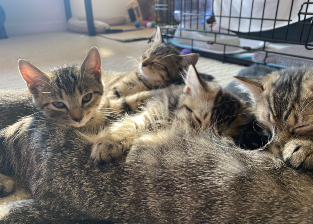We figured it might give Mitsy some well-deserved ‘me-time’. She did enjoy it, lounged on the floor for a bit, while looking at the crazy kittens. And sat on the windowsill for a while. It took most of the kittens 15 minutes or so calm down and go for a nap. Mitsy did not walk up to them so we figured it was OK. After 1.5 hours I let the kittens out and saw a nice family reunion. When I looked in on them a bit later, to my surprise, they were all drinking from Mitsy! That was unexpected, as I had had the impression that her milk was drying up. Apparently not!