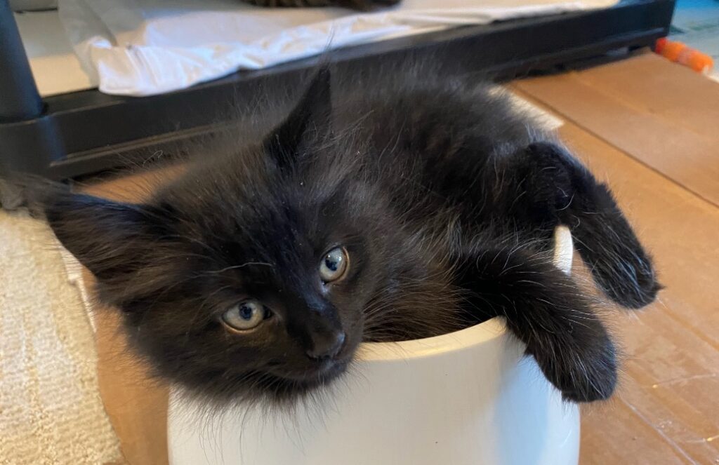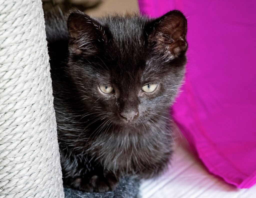 It is said that these long white hairs are typical for young kittens. They are usually longer than the rest of the coat and their function is to help the kitten ‘feel their way’ into the big outdoors. They tell them where their body ends and comes into contact with the world. It helps them with the spatial experience of everything around them. Like, “Will I fit through this hole?” Or: “How close am I to an object?” These hairs have nothing to do with the true colouring of the cat, so I have been told. I have also been told that a truly completely black cat is not very common. We have already seen that neither Pumba nor Spooky are 100% black. Especially in bright sunlight, you can see that they both have tabby markings and they sometimes even look more dark brown than black. Not so strange, if you look at mom and dad. For a cat to come out completely black, both parents have to be black as well. So, our two kittens are not turning gray prematurely, they just have baby hair!