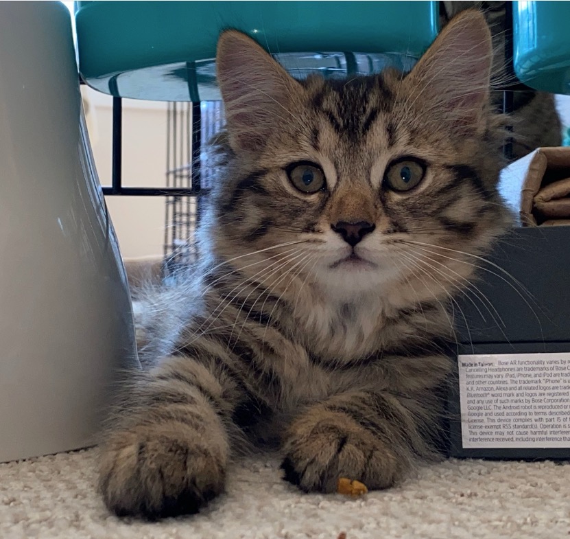 Spooky is sort of the go-between. Due to her long coat you can’t really tell how big she is. She seems more slightly built than the others. Time will tell how tall she will get as an adult female. Pumba and Spooky share a funny characteristic: they both have long white hairs in their otherwise largely black coat. These white hairs are also present in the other kittens, but in Tabbys they are a lot harder to see.