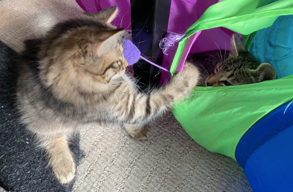 All of our kittens have their own favourite toy: Stick toys with fluffy stuff at the end. You can have them racing around to the point of panting without much trouble. Some go for the fluffy bits, others get triggered by the stick part. They also love tinkling balls. Their absolute favourite toy (see previous post) is the three way play tunnel. And a good tree with some high and enclosed hiding places is also appreciated.