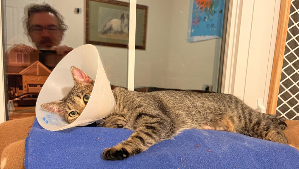 At the end of October Mitsy’s solo time began with spaying surgery. The twins found a new family to live with and the cat room was now Mitsy’s territory. She did not enjoy the beginning of this new stage in her life, because we were told it was best to have a cone put on her head, to prevent her from damaging the incision site on her belly. It is at times like these that you wish that you had already established a completely trusting and comfortable relationship with your cat, to give them comfort and live during her recovery. Fortunately, there was no relapse to feral behaviour in Mitsy when she came back from surgery.