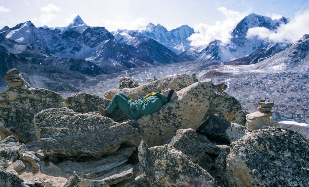 “Just let me get some rest”. Everest in at the back of the photographer…