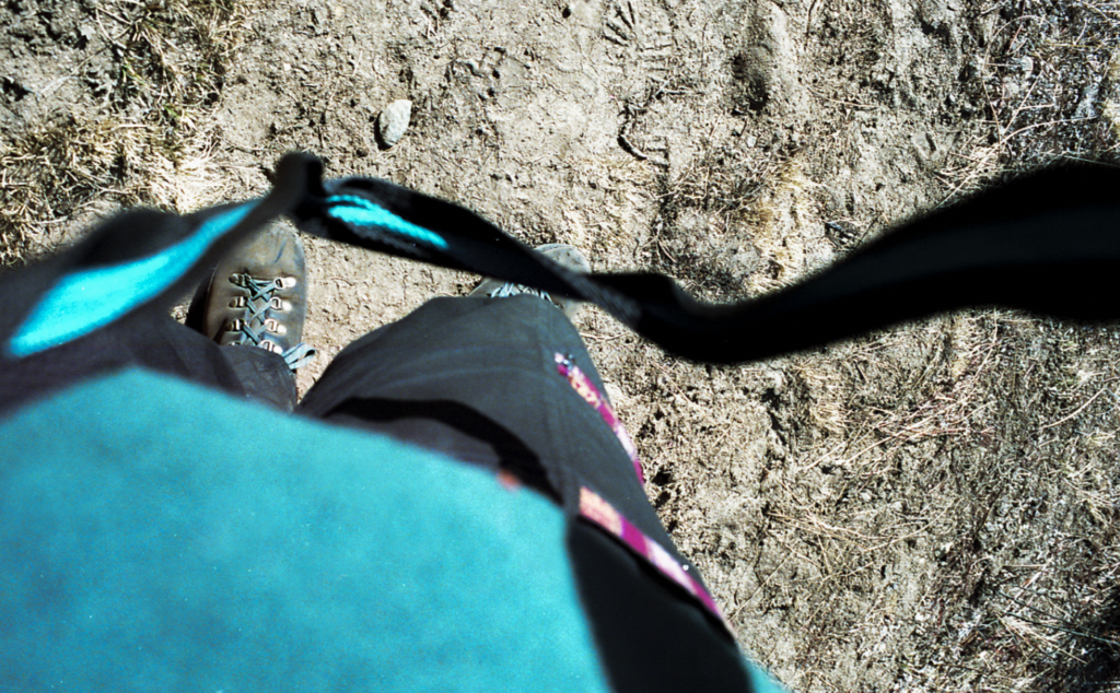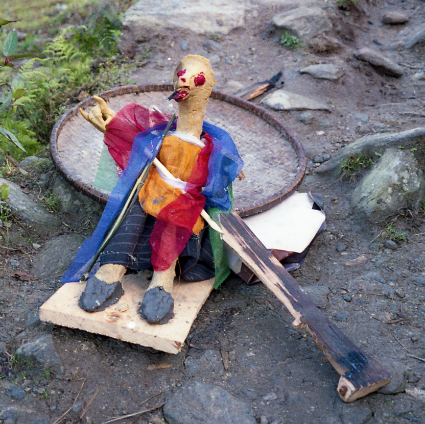 Anu hung around with me on that day, in the back of the pack, helping me carry my already lightened load. At some point, he was pushing me to go a bit faster, which was not really like him. I tended to stop regularly to make photographs. The country is unbelievably beautiful and I just could not stop clicking my camera. And then I saw it. A talisman. It was knee-high, it was very colourful, it was right there in the middle of the trail and it had an injured knee with a cane on it… No way! It stopped me in my tracks, despite Anu trying to make me walk past it without looking at it. He almost walked over it, to my surprise. Many people from Nepal cannot pronounce the ‘F’ and he kept saying: “Come, come, no take poto’s, no poto’s, come…”. I really wanted to respect that but I could not keep myself from snapping a picture of that ‘talisman’.