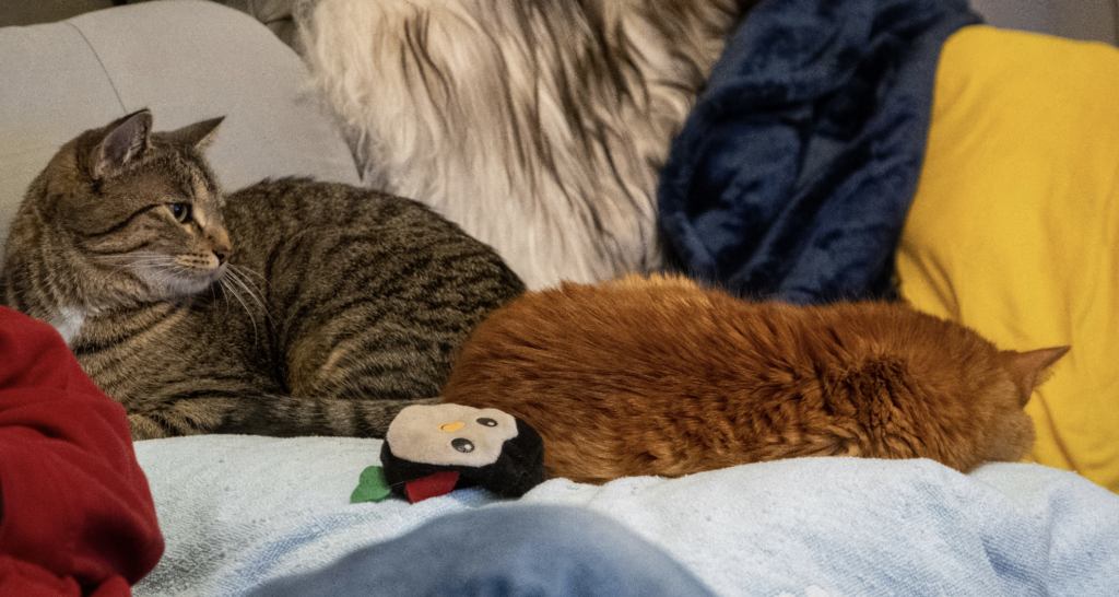 Then Suzi woke up and the two of them were eye-to-eye and Mitsy even put her nose right in Suzi’s face. We could have sworn she wanted to groom her, but that turned out to be too much for Suzi who first hissed and then quickly gave a big eye blink. As if to signal: “Hey, it’s OK, just stay away from my face!”. Mitsy withdrew but stayed on the sofa…