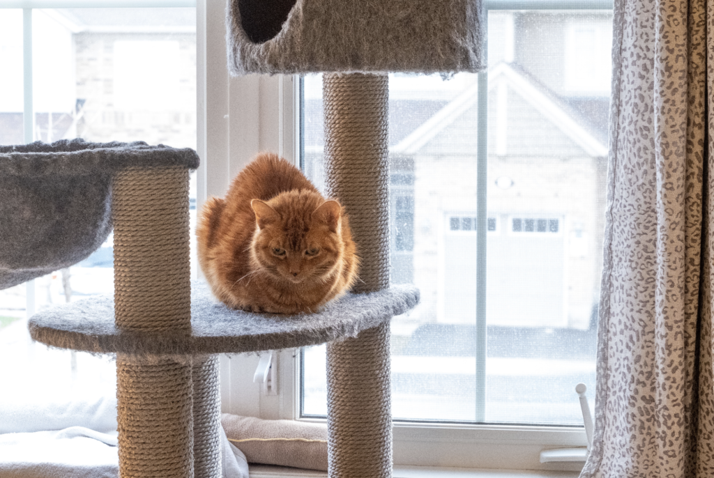There was more to come on New Year’s Day and this time Suzi was the object of Mitsy’s affection. She has been on a mission to get closer to her feline companion since she noticed her in the house. But Suzi, being the scaredy-pants that she is, was always very stand-offish. Nevertheless, she follows Mitsy around the house now. And sometimes sneaks up to the former cat room and even sits on the cat tree in front of the window! Mitsy was sleeping downstairs so it was the world upside down!